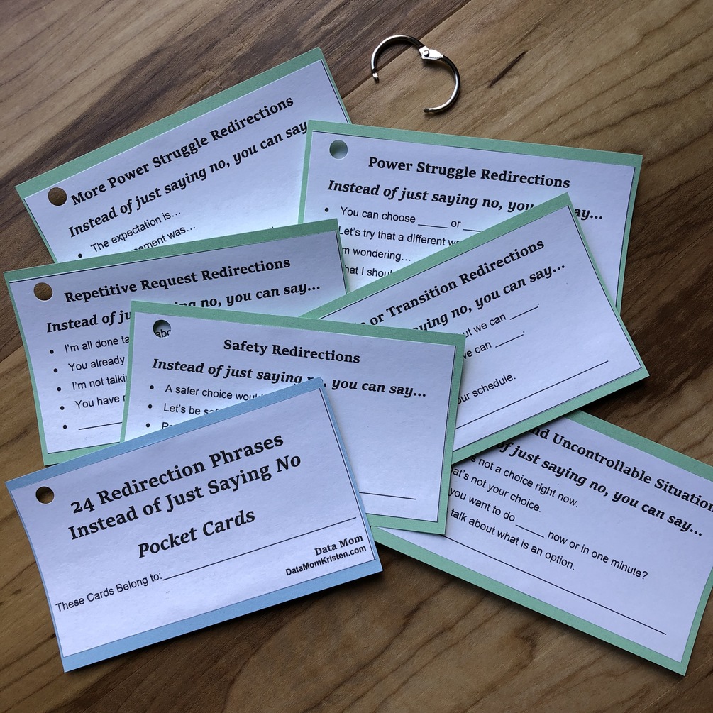 This document takes the redirection phrases from a favorite community freebie, the Redirection Phrases Cheat Sheet, and turns them into convenient, pocket-sized cards.